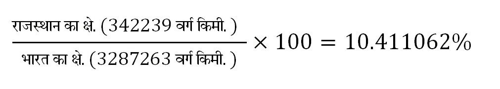- राजस्थान का क्षेत्रफल भारत के कुल क्षेत्रफल का 10.41% या 1/10वाँ भाग है।