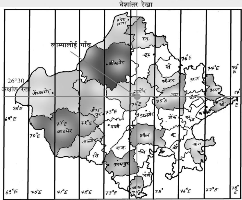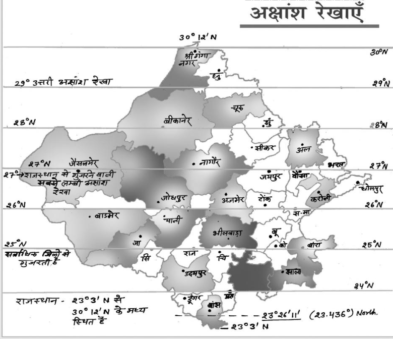 - राजस्थान से पूर्ण मान वाली कुल 7 पूर्ण अक्षांश रेखाएँ गुजरती हैं। 23° N राजस्थान से नहीं गुजरती है।